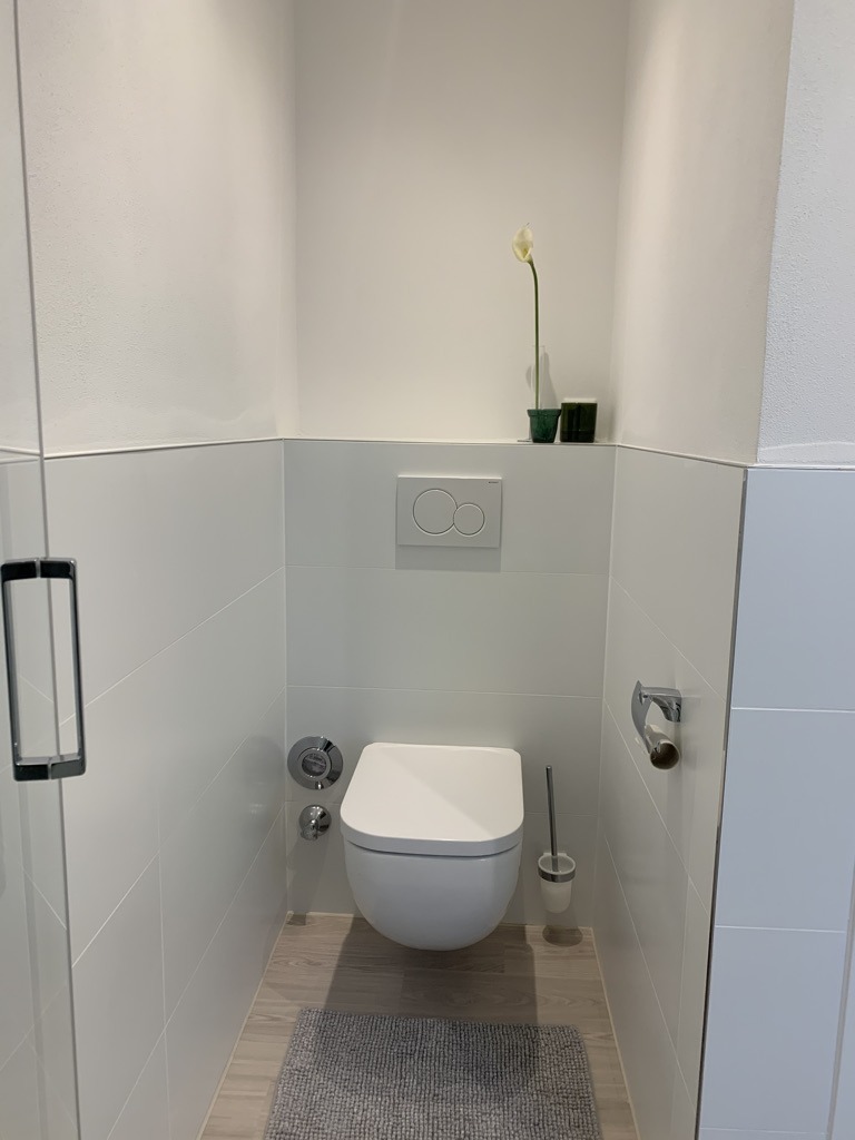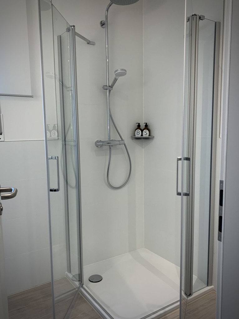 Hier erwartet Sie ein in kompaktes, modernes Duschbad mit Regendusche und Glas-Kabine, wandhängendem WC, Waschtisch mit Unterschrank und Handtuch-Heizkörper. Wir bieten Ihnen flauschige Frottee-Hand & Duschtücher, gängige Pflege-Produkte und einen Haartrockner.
